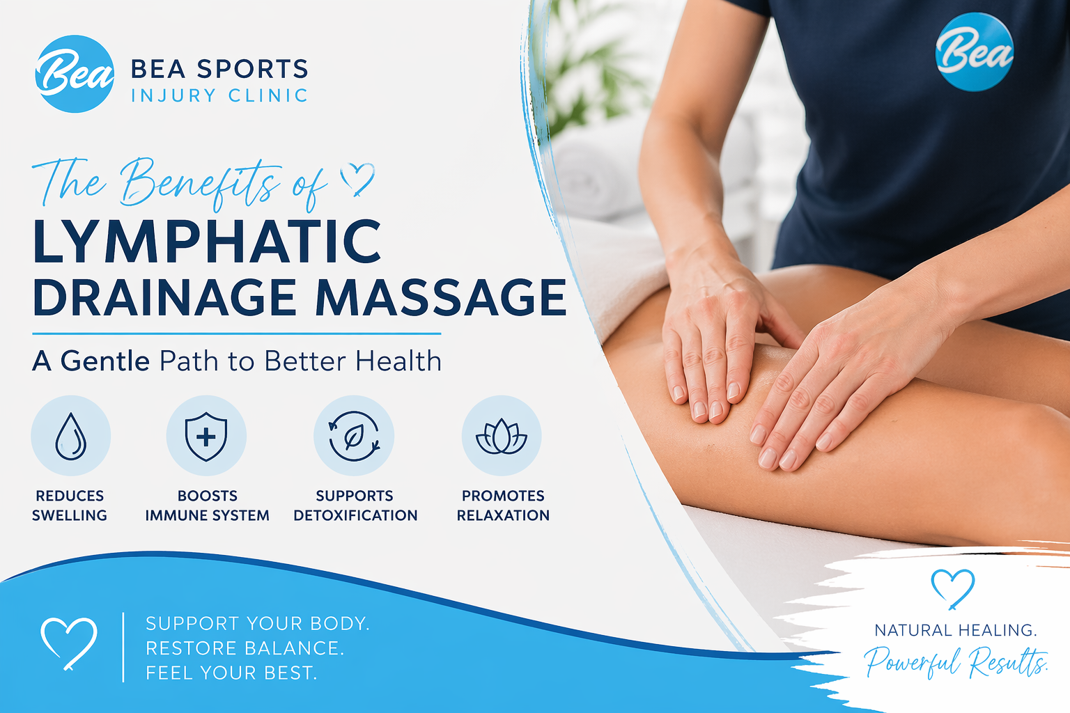 If you’ve been feeling bloated, swollen, or simply run down, your lymphatic system might need a little extra support. At Bea Sports Injury Clinic, one of our most effective yet relaxing treatments is Manual Lymphatic Drainage (MLD) – a gentle therapy designed to help your body restore balance and promote natural healing.